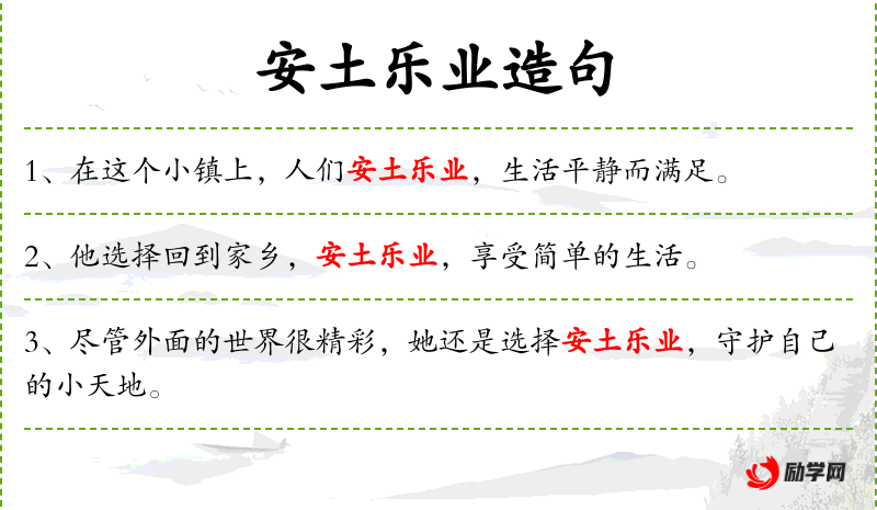 - 安土乐业:安居于自己的乡土,乐于从事自己的职业。