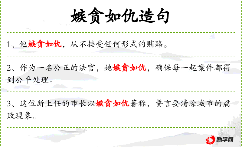 - 嫉贪如仇:形容对贪污行为极其憎恨,如同对待仇敌一样。
