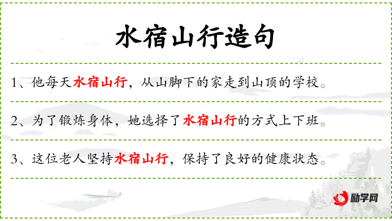 2. 【水宿山行】 - 夜宿于水,日行于山。形容长途跋涉。