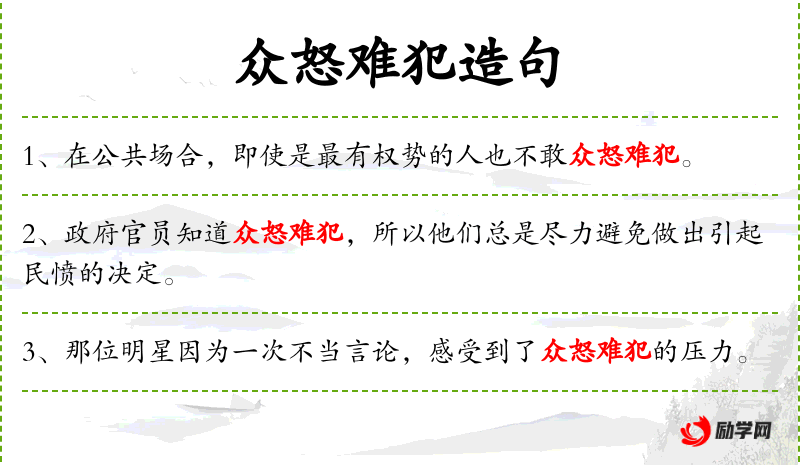 - 众怒难犯:民众的愤怒难以触犯,意指民众的意见和情绪非常重要,不容忽视。