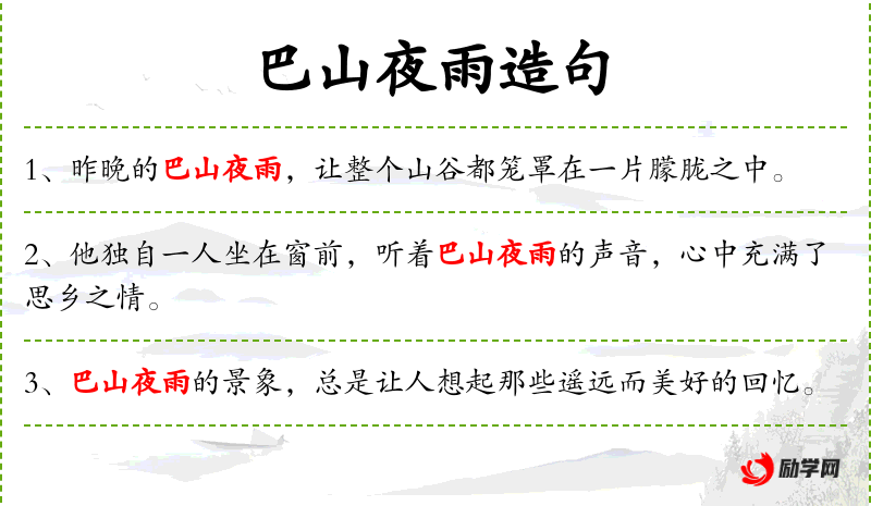 - 文化背景:“巴山夜雨”可能与**文化中的某些诗意或情感有关,如李商隐的诗句“巴山夜雨涨秋池”。