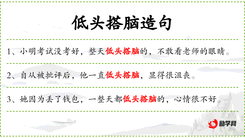 - 低头搭脑:垂头丧气、无精打采