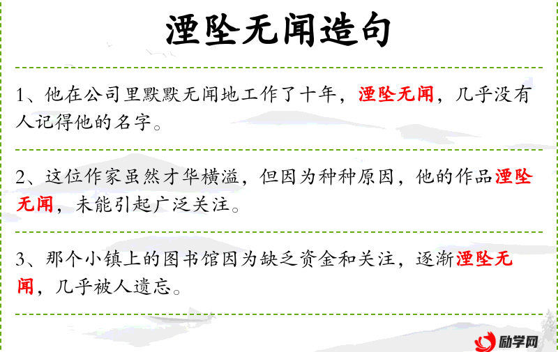 6. 【湮坠无闻】 湮:埋没;无闻:没有知道。名声被埋没,没人知道。