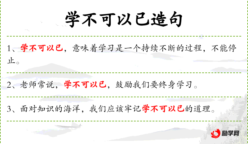 - 学不可以已:学习不应该停止,源自《论语》中的“学而时习之,不亦说乎”。