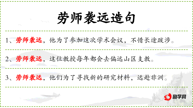 - 劳师袭远:成语,意为不辞劳苦地远行或远赴。