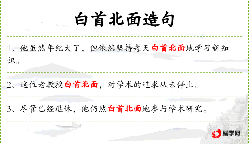 4. 【白首北面】 - 北面:古以南面为尊,北面为卑,此指学生敬师之礼。谓年老犹拜师受业。