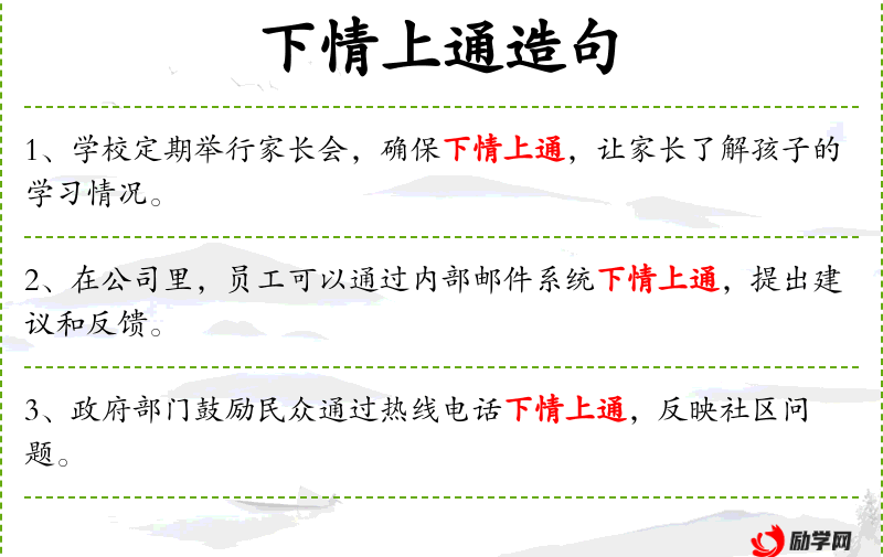 - 下情上通:指下级的情况或信息能够顺畅地传达给上级。