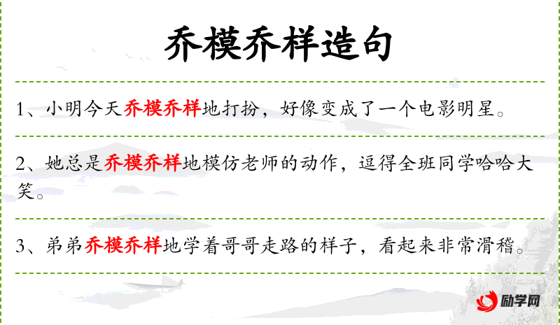 - 乔模乔样:形容词,意思是模仿某种样子,通常带有贬义,表示模仿得不自然或不恰当。