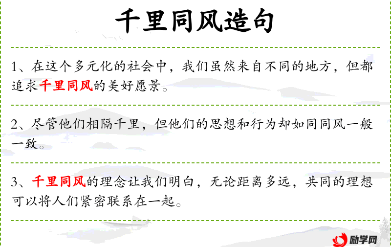 - 千里同风:这个成语源自**古代,意指即使相隔千里,也能感受到相同的风,比喻人们虽然相隔遥远,但心意相通,目标一致。