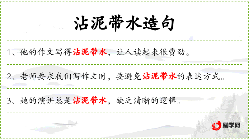1. 【沾泥带水】 - 比喻说话、写文章不简洁或办事不干脆。