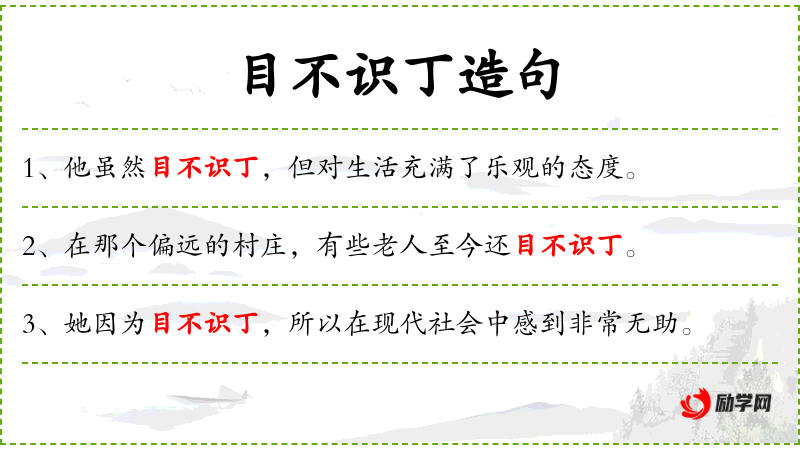 4. 【目不识丁】 连最普通的“丁”字也不认识。形容一个字也不认得。