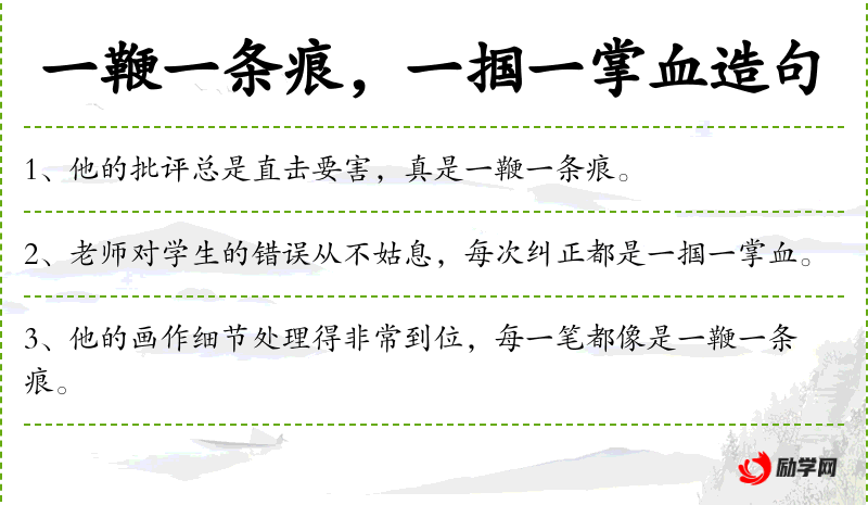1. 【一鞭一条痕】 - 比喻做事着着落实或说话切中要害。同“一棒一条痕”