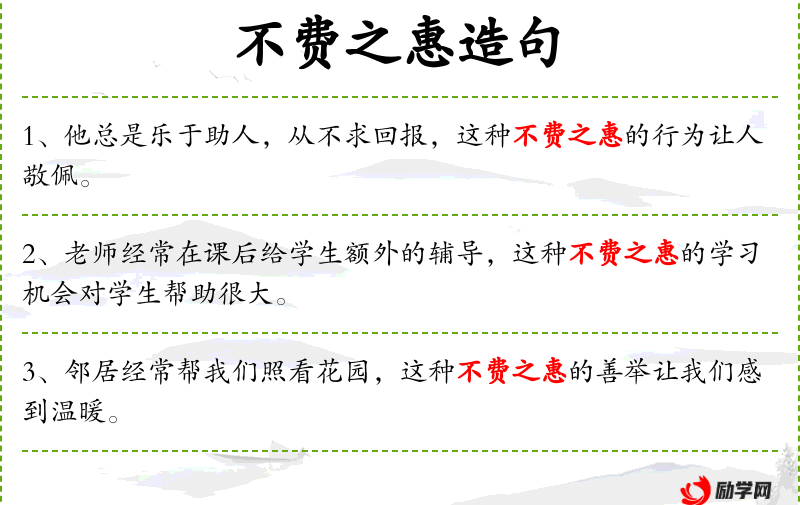 - “不费之惠”强调了帮助的无私和慷慨。