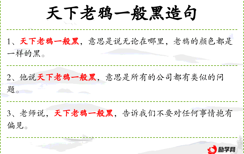 - 成语典故:这句话可能源自对乌鸦普遍黑色的观察,进而引申为对人们行为共性的比喻。