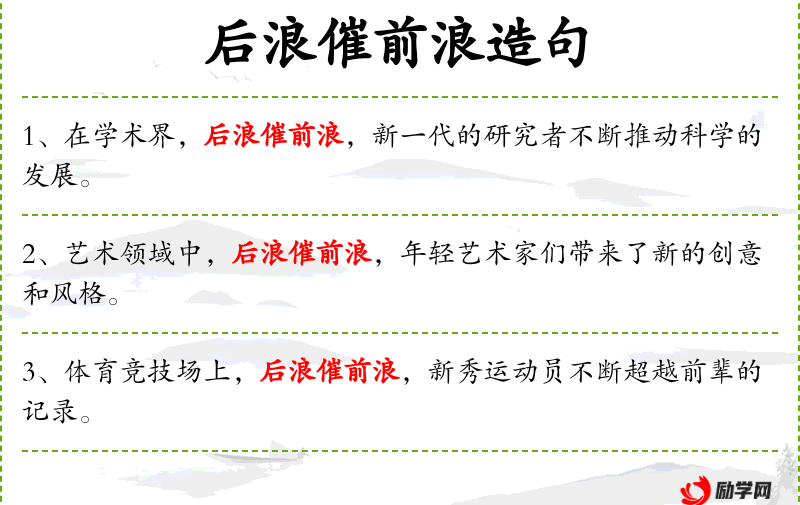 - 后浪催前浪:比喻新一代推动旧一代,常用于形容新一代超越旧一代。