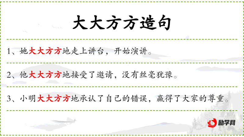 1. 【大大方方】 指人的行为举止自然不俗气。