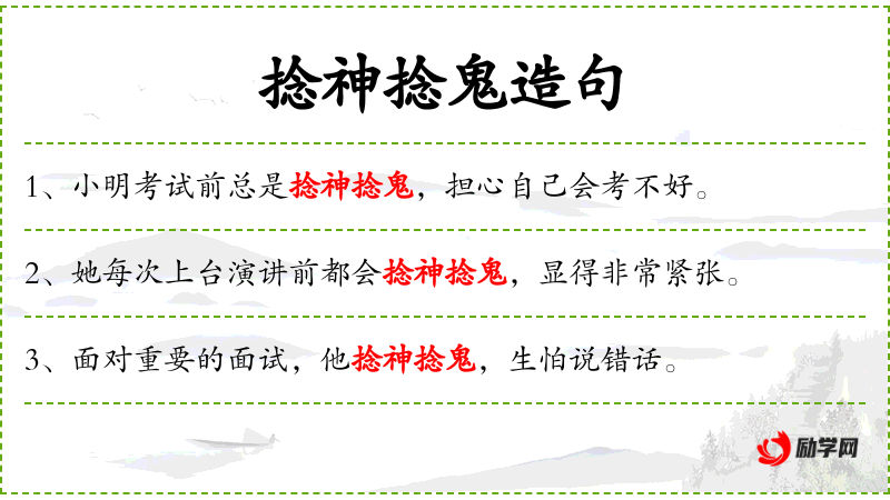 - 会:助动词,表示能力或惯。 . 捻神捻鬼:成语,形容人紧张、心神不宁的样子。
