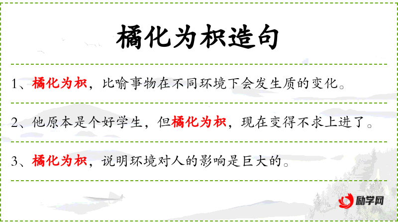 3. 【橘化为枳】 - 比喻人由于环境的影响而变坏。