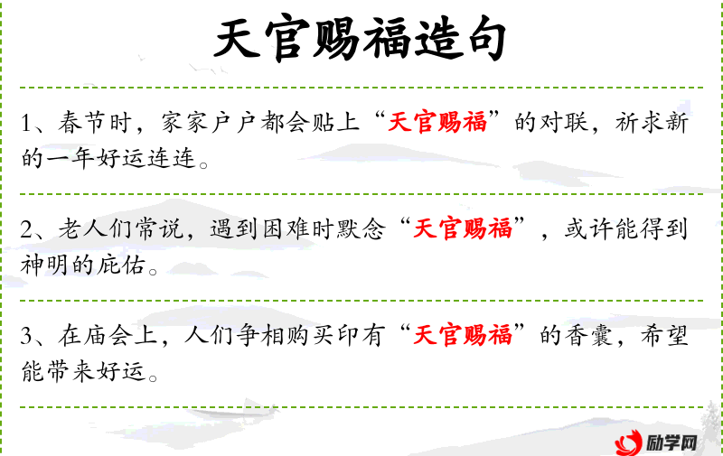 - 天官赐福:**传统文化中的吉祥语,意为天上的官员赐予福气。