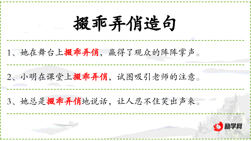 - 掇乖弄俏:这个词组的意思是通过一些小动作或行为来增添趣味或美感,使环境更加愉悦。