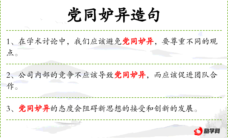 - 党同妒异:指在团体中,成员之间因为嫉妒或不同意见而产生分歧,导致团结受损。