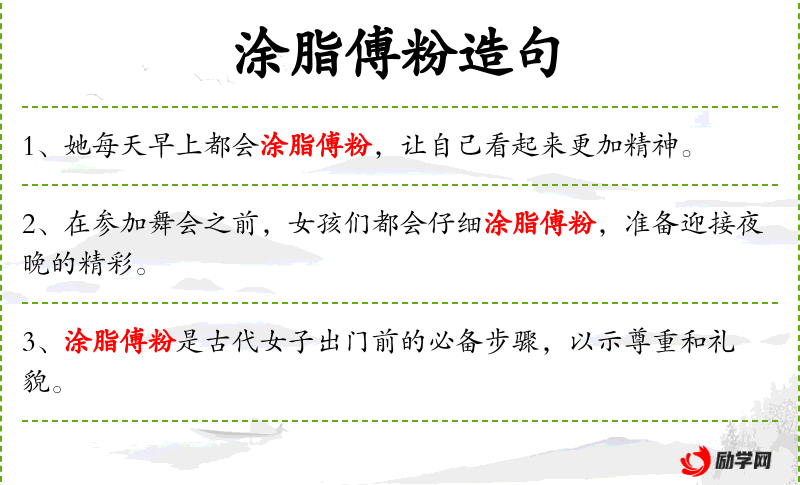 6. 【涂脂傅粉】 脂:胭脂。搽胭脂抹粉。指妇女打扮。也比喻为遮掩丑恶的本质而粉饰打扮。