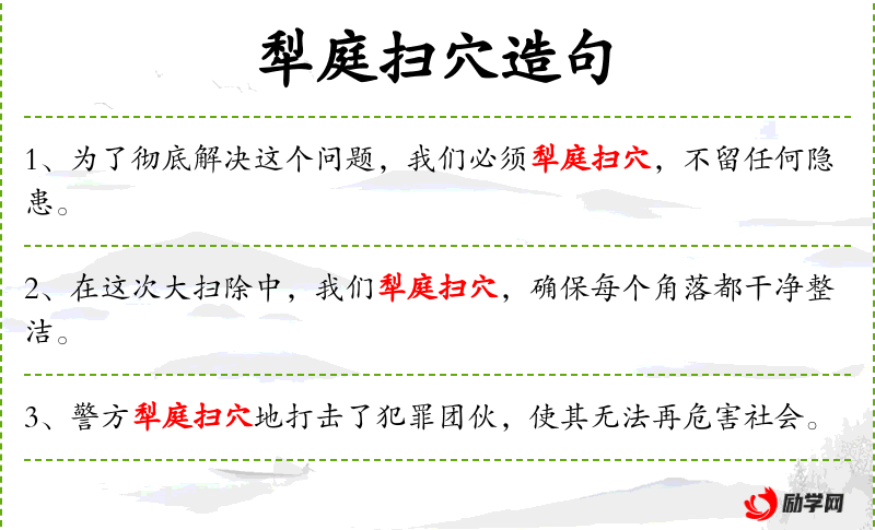 4. 【犁庭扫穴】 - 庭:龙庭,古代匈奴祭祀天神的处所,也是匈奴统治者的军政中心。犁平敌人的大本营,扫荡他的巢穴。比喻彻底摧毁敌方。