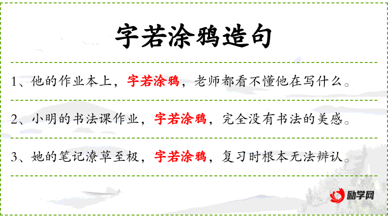 1. 【字若涂鸦】 涂鸦:比喻书法拙劣或胡乱写作。比喻书法拙劣、幼稚