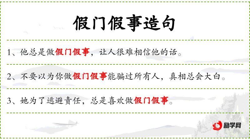 - 假门假事:形容虚假、不真实的行为。