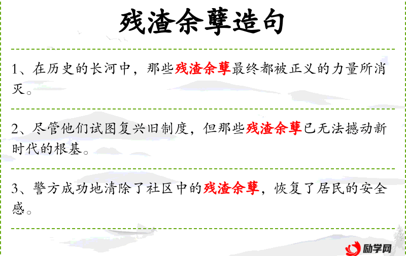 8. 【残渣余孽】 比喻在消灭或淘汰过程中残存下来的坏人。孽,邪恶的东西。