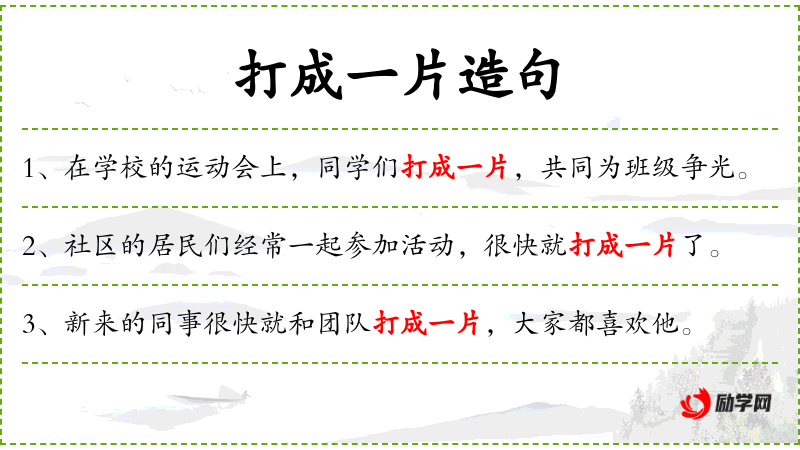 1. 【打成一片】 原指形成一个整体。现多形容感情融洽,成为一体。