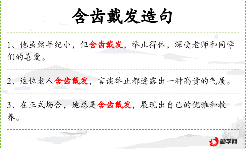 - 含齿戴发:形容老年人保持整洁的外表,含齿指牙齿整齐,戴发指头发梳理得体。