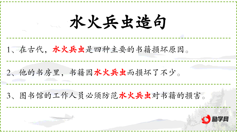 4. 【水火兵虫】 - 指使古书遭受损毁的四种灾害:水灾、火灾、战乱和书蠹。也泛指各种天灾人祸。