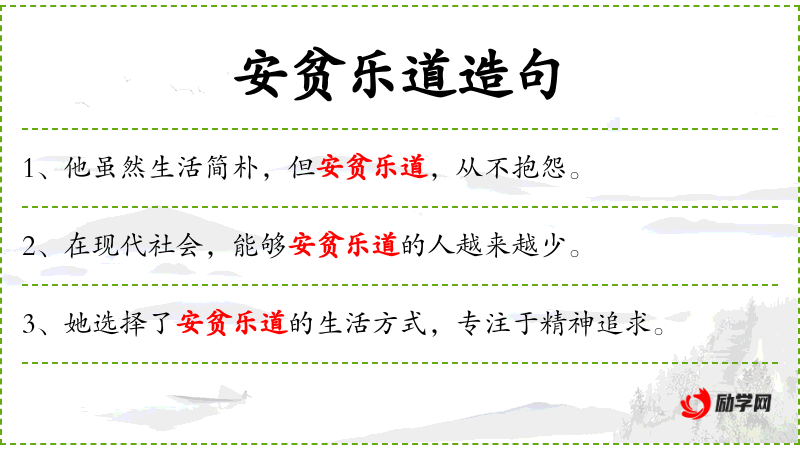 - 安贫乐道:指满足于简朴的生活,乐于遵循道德规范。