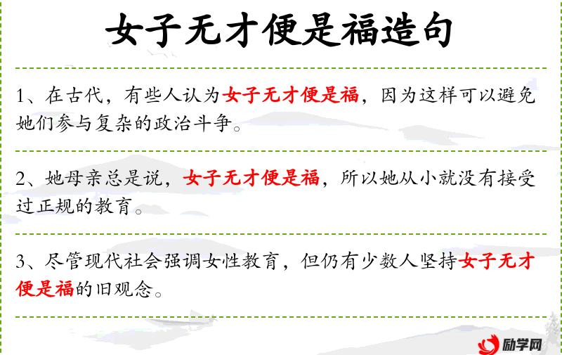 - 女子无才便是福:一种传统观念,认为女性不需要有才能,安于现状就是幸福。