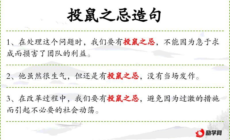 - 投鼠之忌:成语,比喻因顾忌而不敢放手去做。