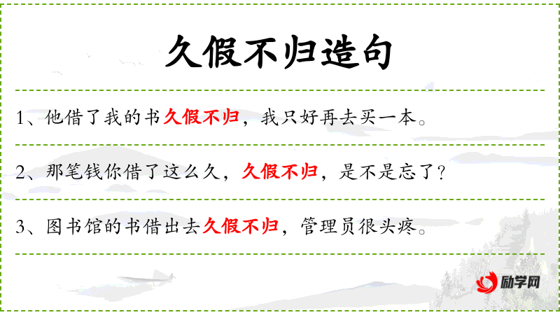 - 成语:“久假不归”源自《左传·僖公二十三年》,原意是指官员长期请假不归,这里用作比喻。