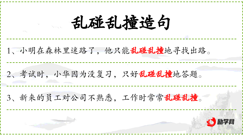 - 乱碰乱撞:形容词短语,描述无序或无目的的动作。