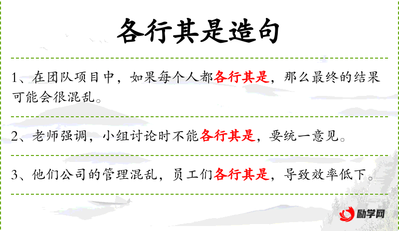 - 各行其是:指各自按照自己的想法或方式行事,不协调一致。