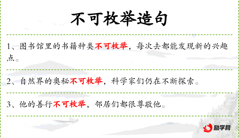 1. 【不可枚举】 枚:个。不能够一个个地列举。形容数量、种类极多。