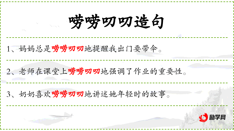 - 情境:某人因为关心或忧虑对方,所以不断叮嘱对方一些事情。