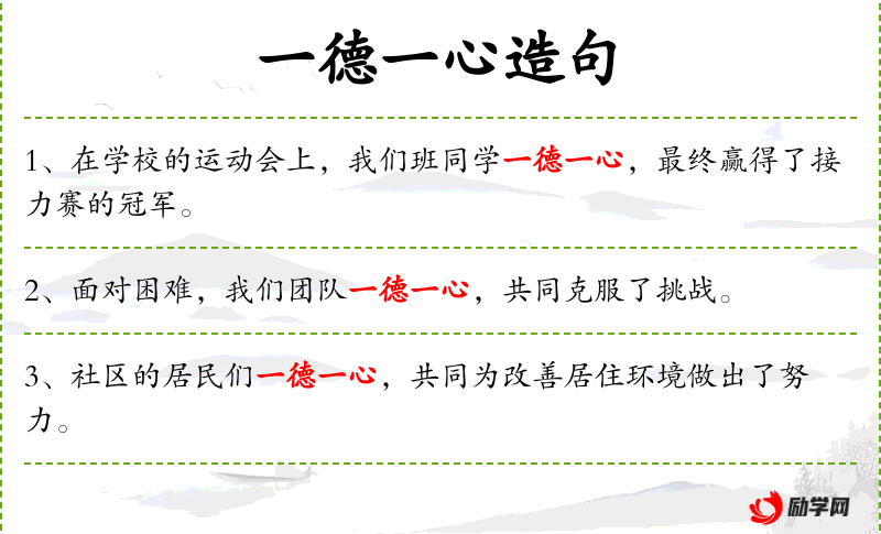 1. 【一德一心】 - 德:心意。大家一条心,为一个共同目标而努力。