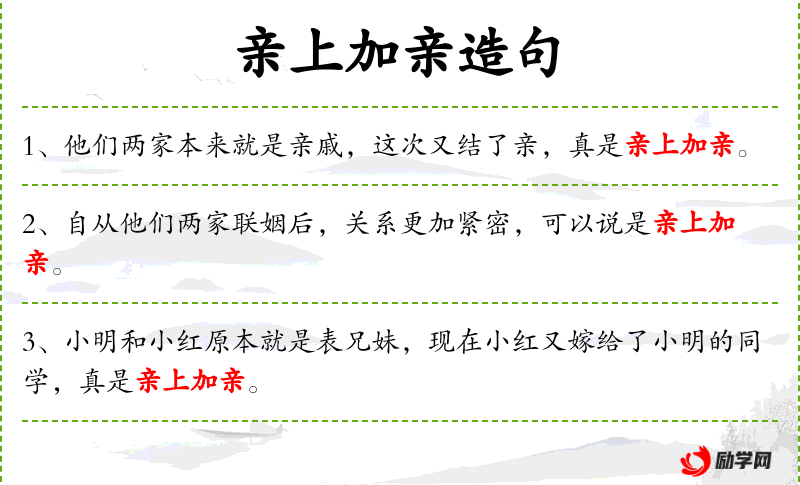 - 成语:“亲上加亲”是一个成语,表示关系更加紧密。