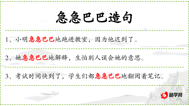 - 急急巴巴地:形容词短语,表示动作急促、匆忙。