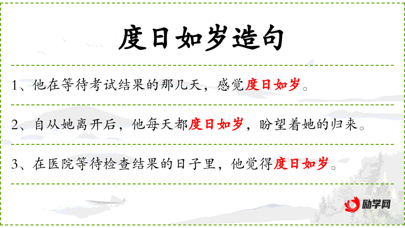 - 度日如岁:成语,形容时间过得非常慢,每一日都像一年那样漫长。
