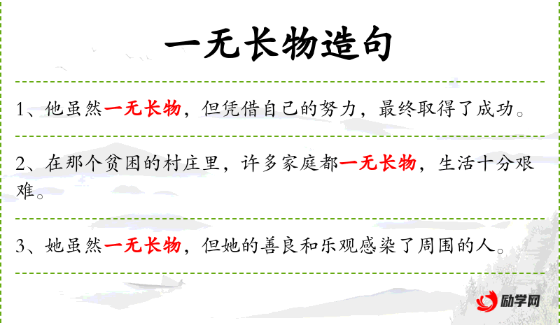 1. 【一无长物】 - 一无:全无;长物:多余的东西。除一身之外再没有多余的东西。原指生活俭朴。现形容贫穷。