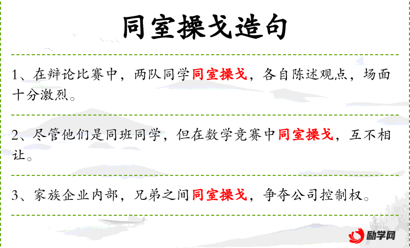- 同室操戈:比喻内部争斗,特别是指家庭或组织内部的冲突。