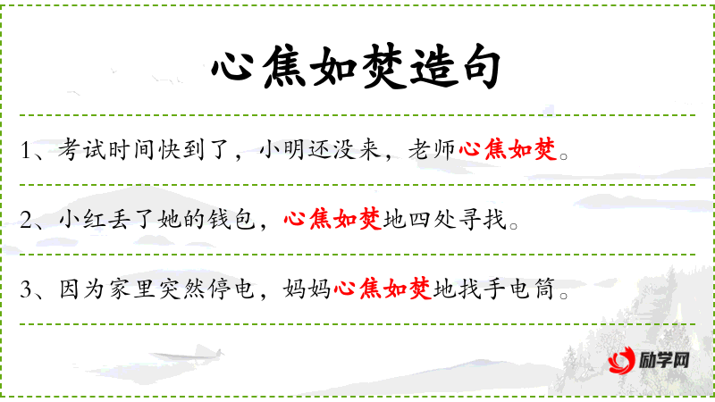 - “作业本不见了,小华心急如焚,四处寻找。”