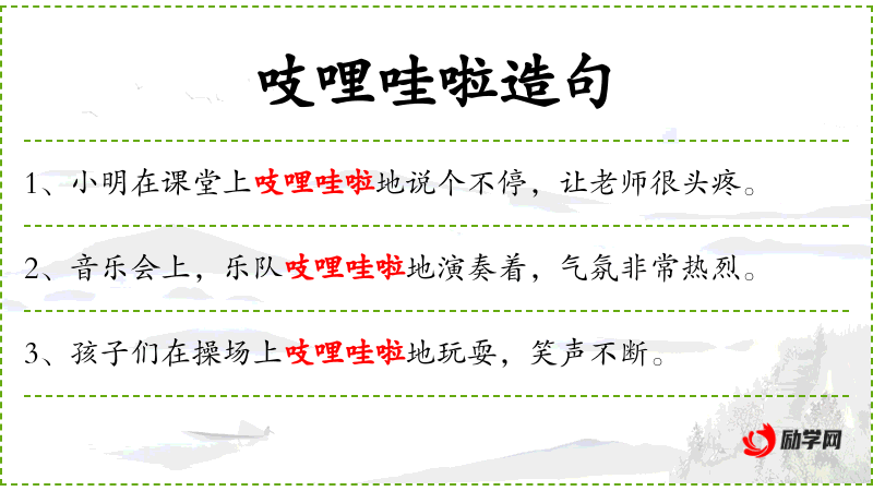 - 吱哩哇啦:拟声词,形容声音杂乱或不和谐。