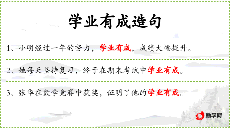 - 学业有成:固定短语,表示在学*上取得了成功。